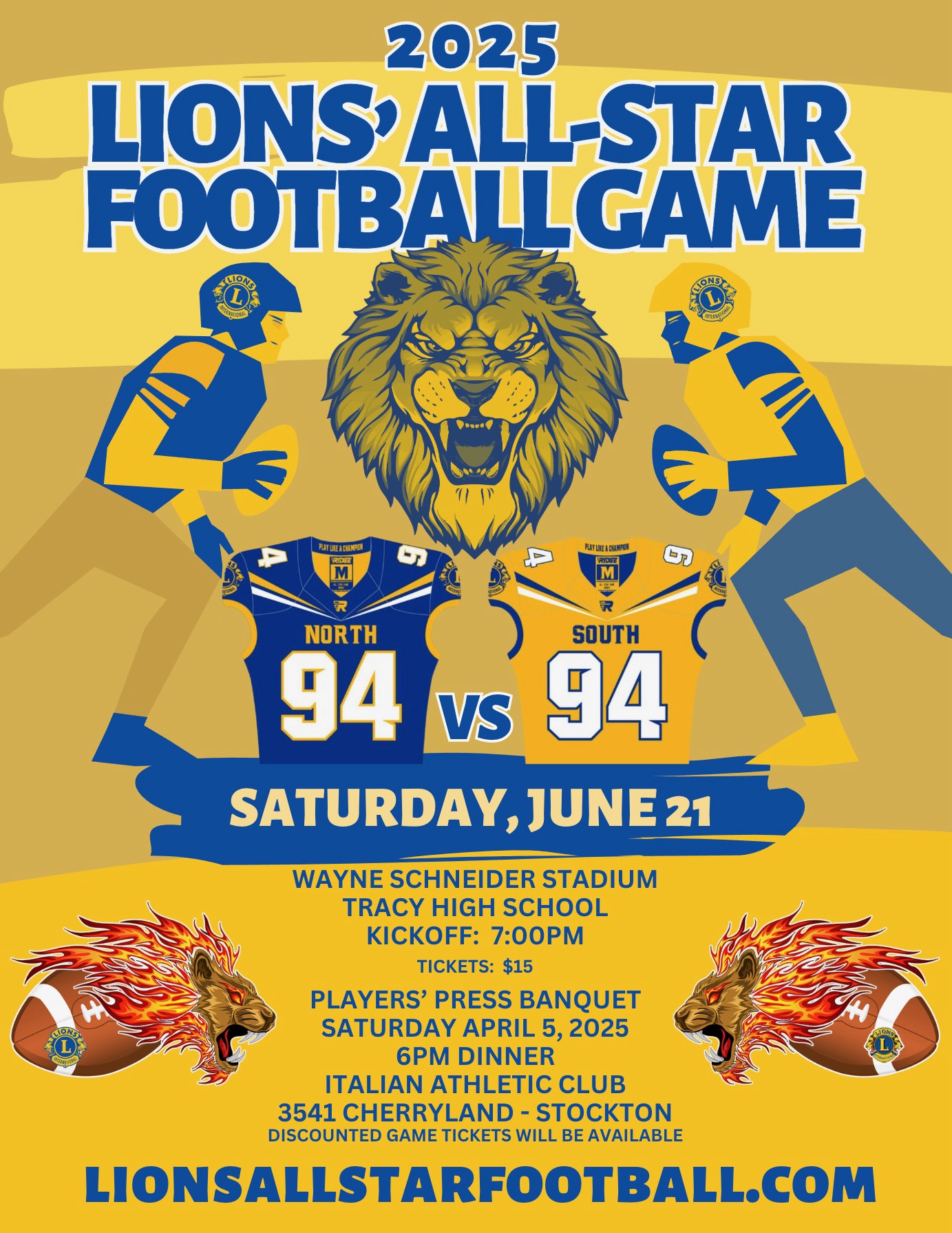 Lions All-Star Football Game! June 21 – 6 PM Pre-Game. 7 PM Game Time – at Tracy High School, Tracy CA, Wayne Schneider Stadium. Thank you for your support. FLIER