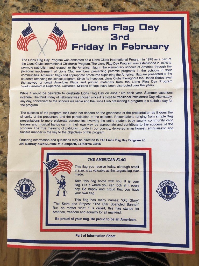 Over 25 years ago, Past District Governor Al Richter (4-C6 and 4-A1) initiated “Flag Day.” The Lions have now presented over 2,500,000 flags and we hope more clubs will become involved in this patriotic program. The response to the Lions Flag Day Program shows that patriotism still stands high in our country.
