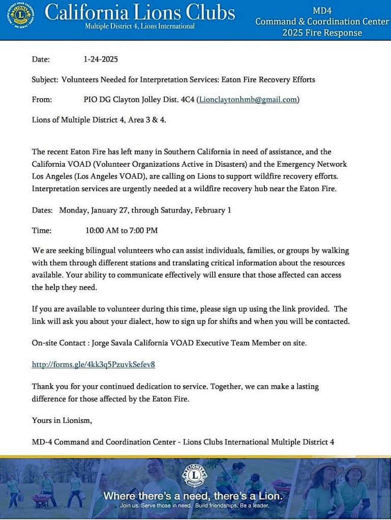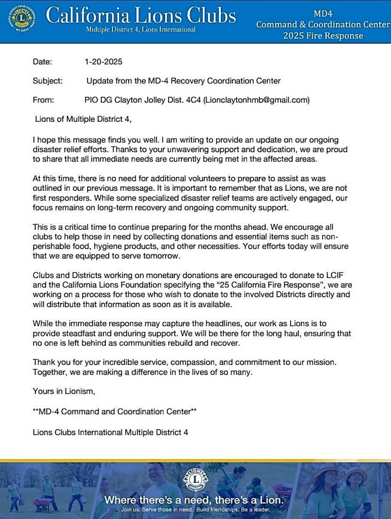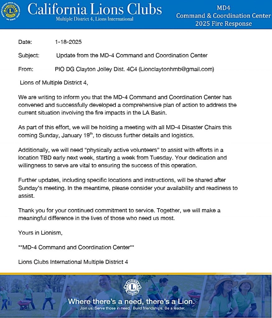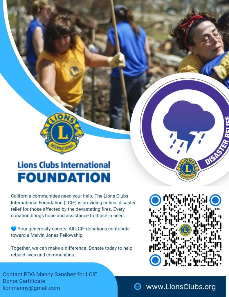 LA Fire Relief and Recovery Effort – “Be prepared and wait” is the main theme. The affected area has enough food and clothing. The three affected districts are still conducting regular Lions activities. Lions Leaders are organizing the unified Command Center. (More info will come.) Past International Director Bob Lee from Hawaii, who will be the special guest at our upcoming District Convention, shared his experience of the Lahaina Fire. When Red Cross, FEMA, and other organizations leave, Lions are still there to serve the local recovery effort. I understand adrenaline is high, and some of us are also anxious and have mixed feelings. Please understand that Lions are working on it. The best thing to do is to donate to Lions Clubs International Foundation, California Lions Foundation/Wildfires, and Lions District 4-A1 Disaster Relief Inc. EIN: 61-1864195. [See address below] Indicate it’s for “Southern California Fires”.